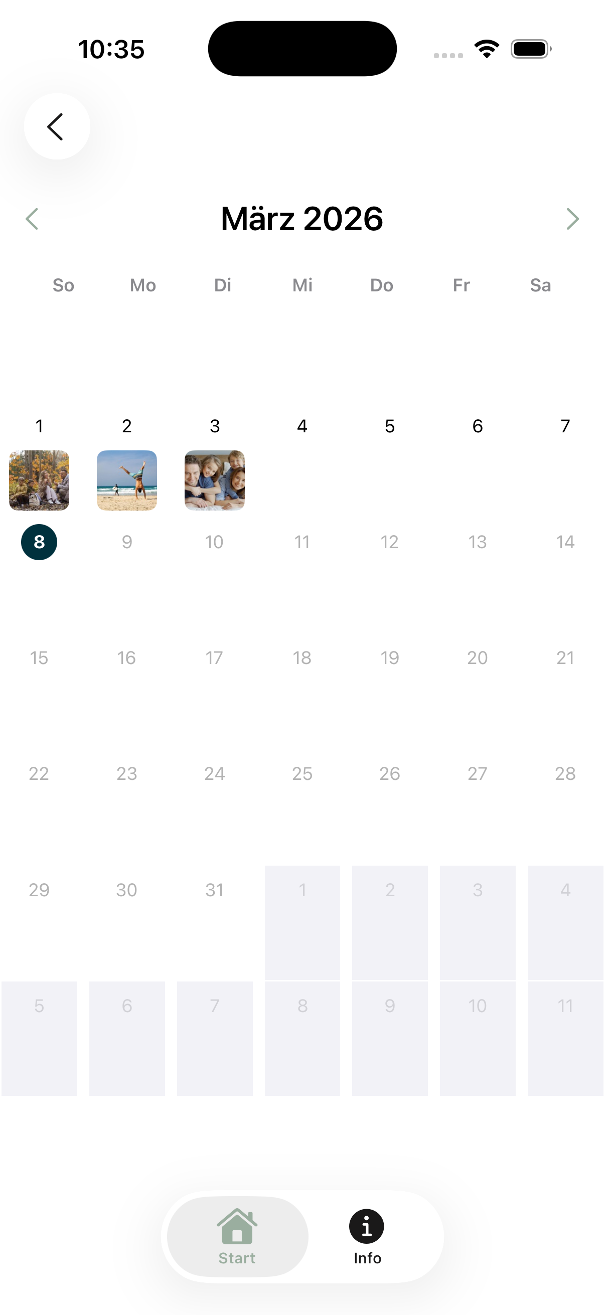 Lege pro Kalenderjahr und pro Tag ein oder mehrere Clips/Bilder ab. Perfekt für